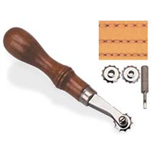 This set comes with 3 wheels for spacing hand stitching holes and running over completed stitches to give them a machine-sewn look. The wheels mark 5, 6 or 7 holes per inch. Also included is a screwdriver to change the wheels. There are 10 designs of embossing wheeles that fit this habdle too. Search for Craftool Embossing Wheels.
