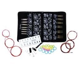 Contains 13 needle tips in US 2 (2.75mm), US 3 (3.25mm), US 4 (3.55mm) , US 5 (3.75mm), US 6 (4mm), US 7 (4.5mm), US 8 (5mm), US 9 (5.5mm), US 10 (6mm), US 10-1/2 (6.5mm), US 11 (8mm), US 13 (9mm), and US 15 (10mm). Each needle tip measures 5" (13mm). Two sets of cords, one set for the needles with the S screws, and one set for those with L screws. Three cords, one each measuring 24" (60cm), 32" (80cm), and 40" (100cm). Two S and L end caps, one S and L cord connector for making even longer cords, two cord keys, a ruler/needle sizer, and a collection of stitch markers.