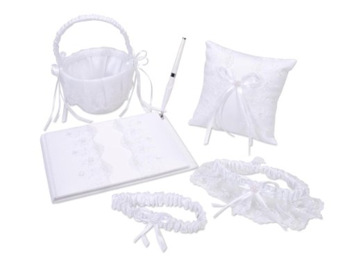 Each item in this lovely 5 piece wedding gift set is embellished with delicate pearl accented lace. Every accessory except the guestbook has a white satin bow with a flower pearl center. Set includes basket, pillow, two garters and a guestbook. Guestbook includes matching pen and pages measure 8 by 6 inches. 1 garter is a toss away. Pillow measures 6-1/2 inches square.